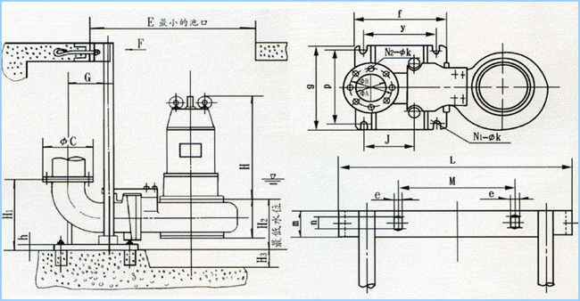 WQ型無堵塞潛水排污泵外形安裝尺寸圖: |