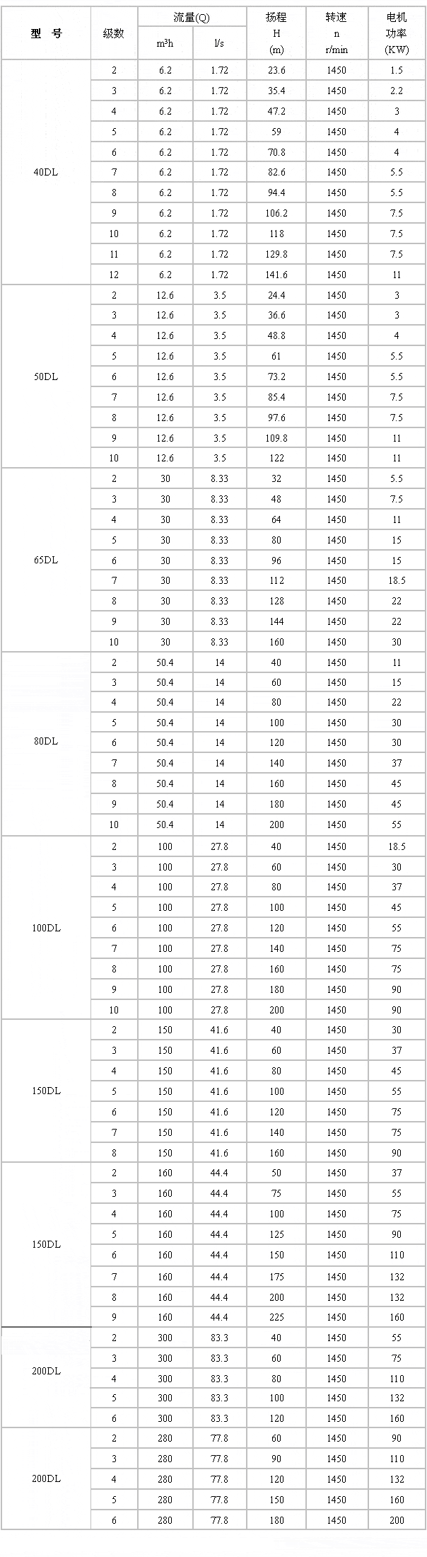 六、DL立式多級離心泵性能參數(shù):
