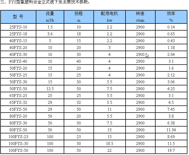 FYS系列氟塑料合金立式液下泵是我公司結合國內外同類產品研制生產的一種單級單吸長軸式液下泵,該泵適用于輸送溫度在0℃-80℃,不含固體顆粒、磨料的有腐蝕性的介質。FYS系列液下泵所有與介質接觸的部分全部包有氟塑料合金,下護套采用優(yōu)質碳化硅制造,具有耐磨、耐腐蝕等優(yōu)點。泵性能范圍:流量1.6m3/h-100m3/h,揚程:5m-1m。FYS系列耐腐蝕立式液下泵在啟動時,液位高度必須高于葉輪中心線以上180mm。
