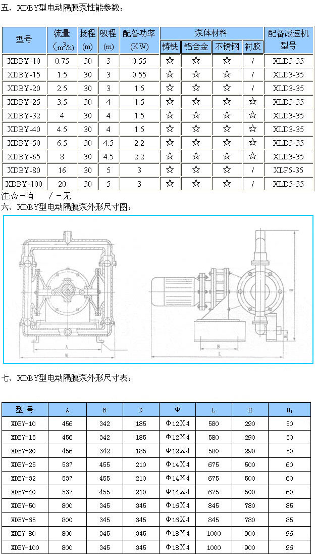 新研制開發(fā)的XDBY型電動(dòng)隔膜泵,采用XLD系列擺線針輪減速機(jī)傳動(dòng)動(dòng)力,電動(dòng)隔膜泵是一種新型的泵類,近年來,由于在隔膜材質(zhì)上取得了突破性的進(jìn)展,國際上越來越多的工業(yè)化國家采用此種型式的泵,取代部份離心泵螺桿泵,來應(yīng)用于石化、陶瓷、冶金等行業(yè),產(chǎn)品設(shè)計(jì)均參考美國ABEL公司樣機(jī),該泵適用于低壓,即出口壓力≤3kgf/cm2的場合。