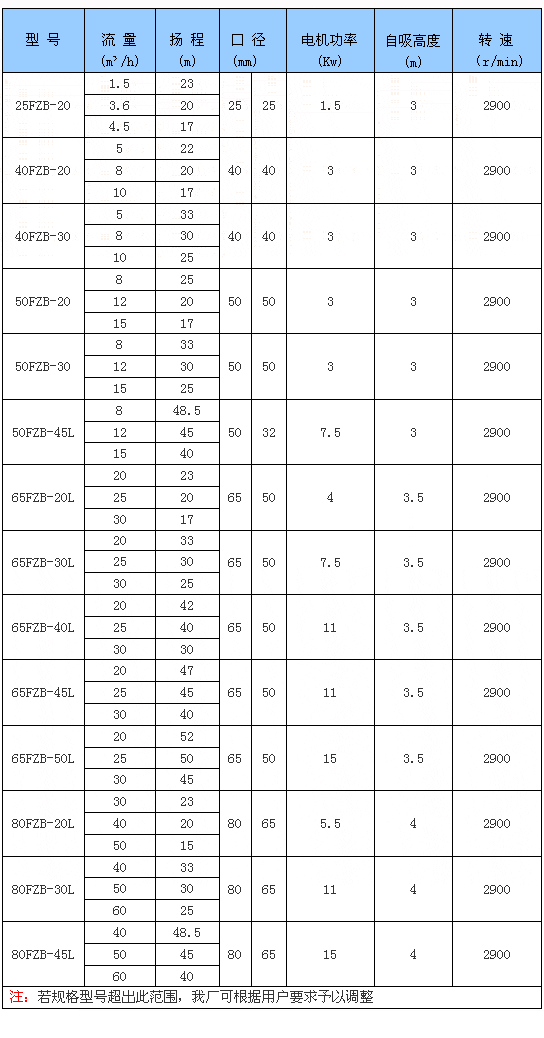 FZB自吸泵的過流部件全部采用氟塑料制造,且又具有自吸功能,因此,F(xiàn)ZB自吸泵的用途極為廣泛,如:將地下槽中的腐蝕性液體抽送至目標地點,將底端無出口的酸堿槽中的酸堿抽送到目標地點,或用于多個酸槽之間的循環(huán),或用于卸酸等等。