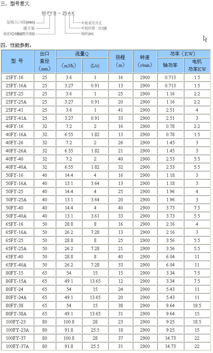 FY系列液下泵是本單位在傳統(tǒng)耐腐蝕液下泵基礎(chǔ)上,融合瑞士蘇爾壽公司同類產(chǎn)品的先進技術(shù),經(jīng)改進設(shè)計而生產(chǎn)的新型泵;該泵取消了其他液下泵普遍采用的機械密封和選用了獨特結(jié)構(gòu)的葉輪,使泵高效節(jié)能、無泄漏、壽命特長,從而廣泛應(yīng)用于石油、化工、制藥、造紙、冶金、污水處理等行業(yè)。