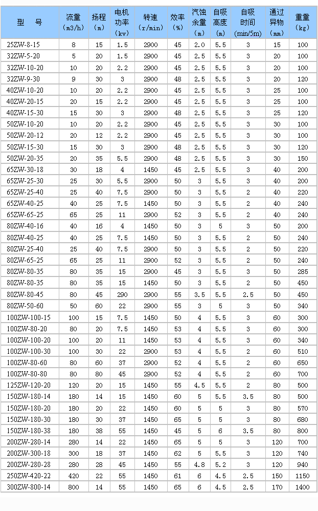 六、ZW型自吸式無(wú)堵塞排污泵性能參數(shù):